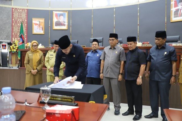 Wali Kota Padang Fadly Amran menandatangani pengesahan RPJMD Tahun 2025-2029 disaksikan Pimpinan DPRD Kota Padang