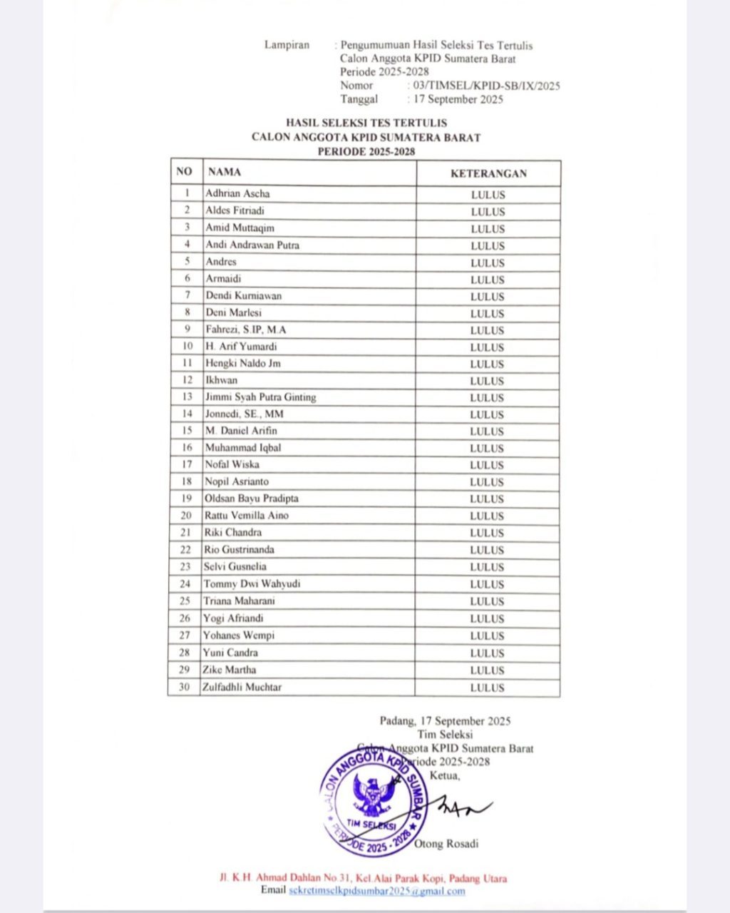 30 orang dinyatakan lulus dari Tes Tertulis seleksi Komisioner Komisi Penyiaran Indonesia Daerah (KPID) Sumbar periode 2025–2028. Mereka akan masuk pada tahapan selanjutnya yaitu Test Psikologi.
