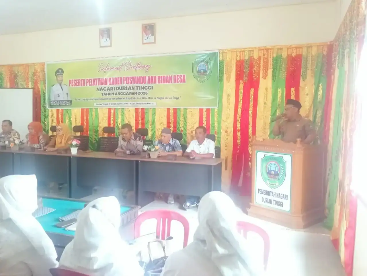 Pemerintah Nagari Durian Tinggi menggelar Pelatihan Kader Posyandu dan Bidan Desa Tahun Anggaran 2026 sebagai upaya meningkatkan kapasitas sumber daya manusia dalam mendukung pelayanan kesehatan dasar di tingkat nagari, yang dilaksanakan di Gedung Pertemuan Anak Nagari, Selasa (21/04/2026).