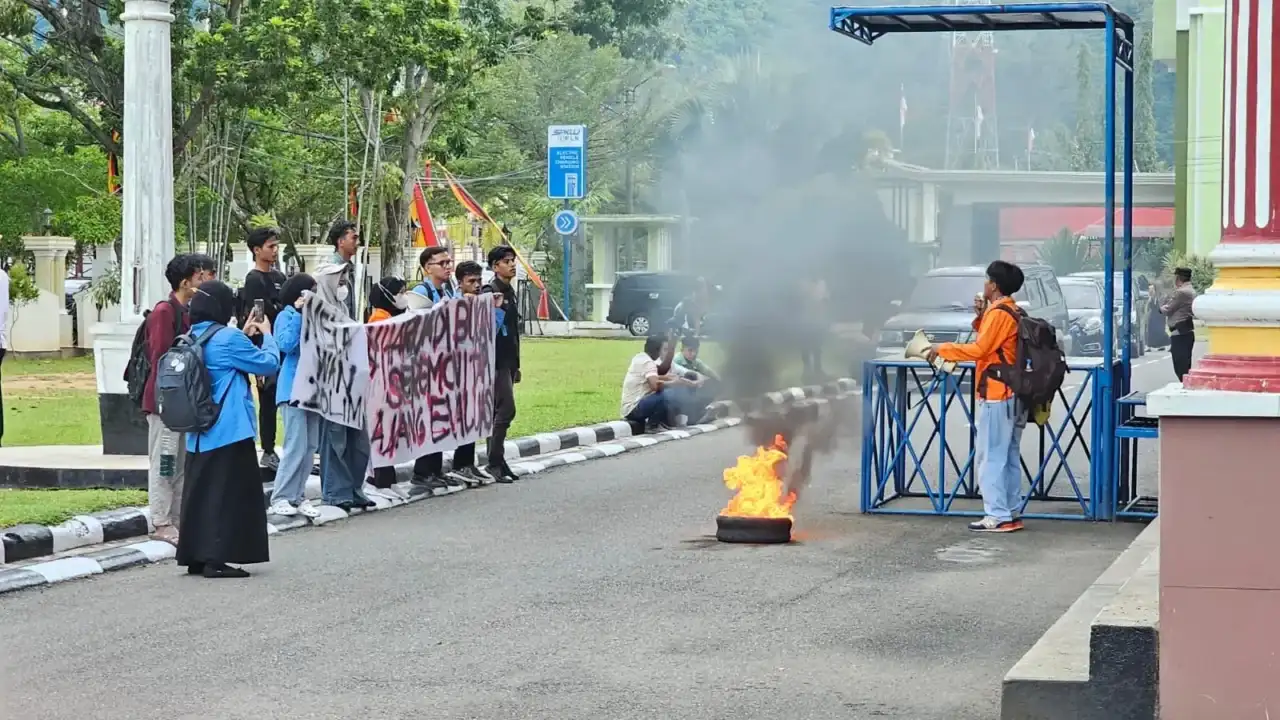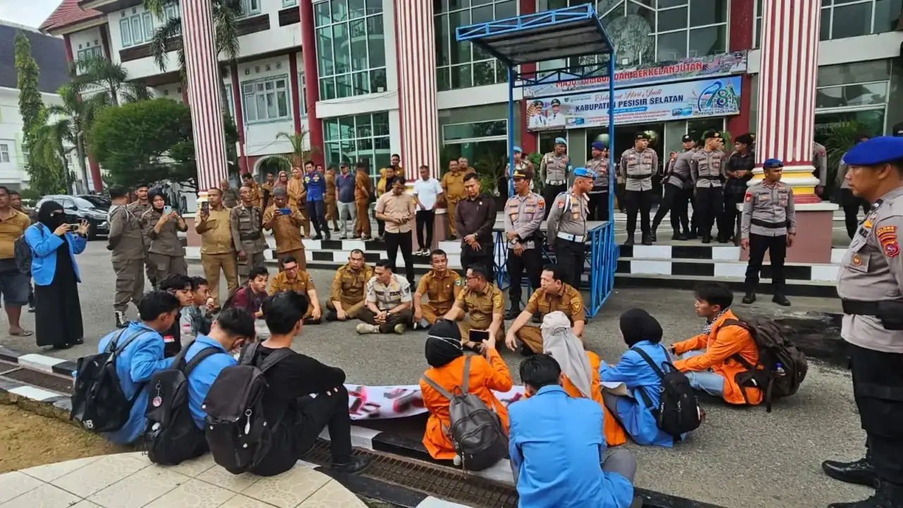 Mengatasnamakan Aliansi Mahasiswa Pesisir Selatan, belasan orang mahasiswa menggeruduk Kantor Bupati Pesisir Selatan, Senin (20/4/2026) sekitar pukul 15.30 WIB. Mereka melakukan aksi damai, menyampaikan orasi dan tuntutan melalui bentangan spanduk.