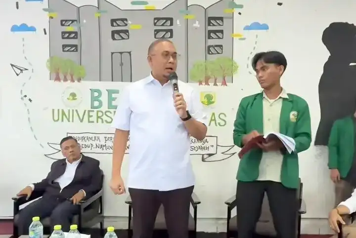 Wakil Ketua Komisi VI DPR RI, Andre Rosiade, menghadiri langsung diskusi publik yang digelar BEM KM Universitas Andalas (Unand), Kamis (9/4/2026).