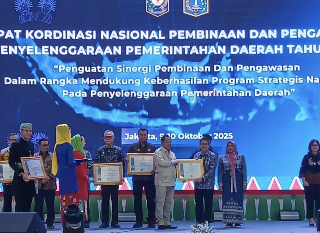 Penghargaan tersebut diserahkan langsung oleh Mendagri di sela kegiatan Rapat Koordinasi Nasional Pengawasan (Rakorwasnas) 2025 yang digelar di Hotel Pullman Jakarta Central Park, Kamis (9/10/2025).