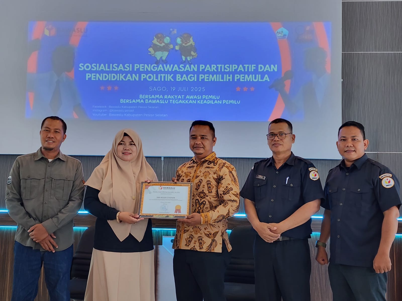 Badan Pengawas Pemilihan Umum (Bawaslu) Kabupaten Pesisir Selatan (Pessel) Provinsi Sumatera Barat, mengunjungi SMAN 3 Painan dalam rangka sosialisasi pengawasan partisipatif dan pendidikan politik di sekolah tersebut, Sabtu (19/7/2025).