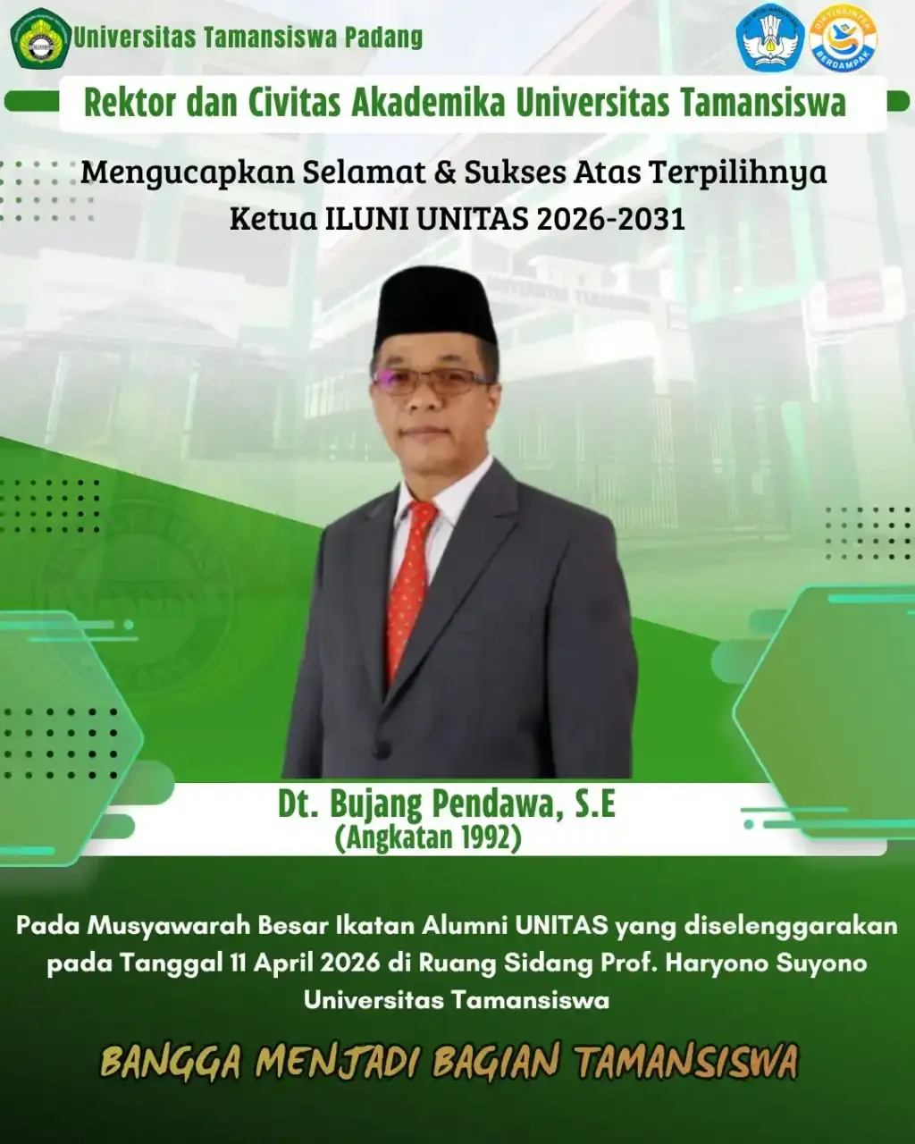 Bujang Pendawa mengajak kebersamaan kepada peserta dan seluruh alumni Universitas Tamansiswa Padang. Dalam pidato penyampaian visi misinya, Bujang Pendawa bersama pengurus nantinya, membuat program kerja, yang mampu dan ikut berkontribusi dalam memajukan perguruan tinggi tertua di Indonesia itu.