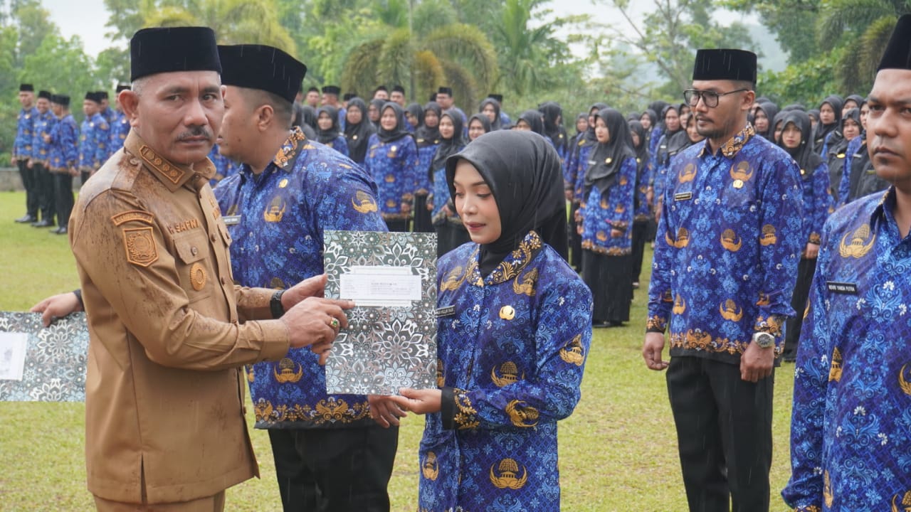 Dalam sambutannya, Bupati H. Safni menyampaikan rasa bangga dan ucapan selamat kepada para PPPK dan CPNS yang berhasil melewati seleksi panjang. Ia menekankan pentingnya nilai-nilai dasar ASN yang dirangkum dalam akronim “BerAKHLAK” Berorientasi Pelayanan, Akuntabel, Kompeten, Harmonis, Loyal, Adaptif, dan Kolaboratif.