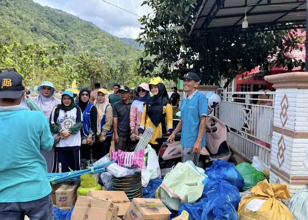 Darma Wanita Persatuan (DWP) Kabupaten Pesisir Selatan berkolaborasi dengan Ikatan Wanita Pengusaha Indonesia (IWAPI) dan Komunitas Pertamus Rawang Painan turun langsung membantu warga terdampak banjir dan longsor di Nagari Muaro Aia, Kecamatan Bayang Utara, Jumat (5/12/2025).