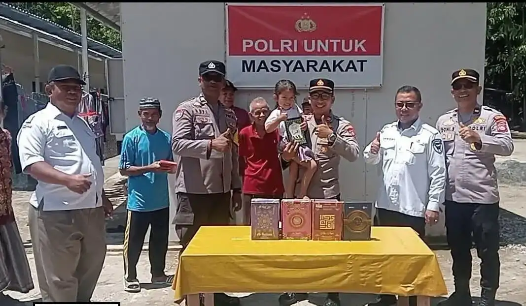 Selain memberikan solusi teknis, kunjungan ini juga diisi dengan penyerahan bantuan berupa 13 buah Al-Qur’an dan 5 buku Iqra oleh Bhabinkamtibmas Aiptu Refi Yulianda sebagai bentuk dukungan terhadap pembinaan mental spiritual warga Huntara.