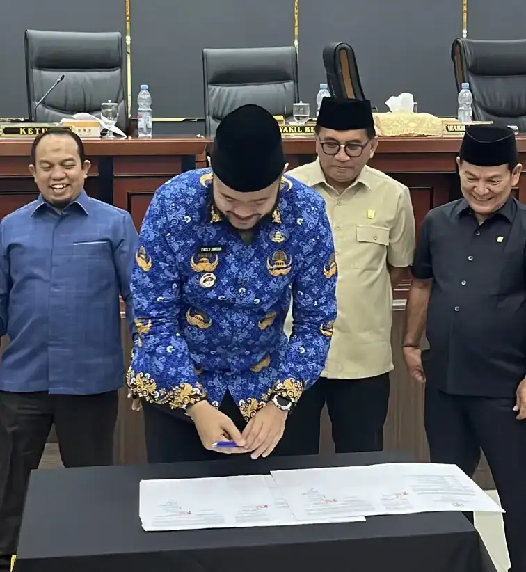 Wali Kota Padang Fadly Amran menandatangani Ranperda menjadi Perda, disaksikan Pimpinan DPRD Kota Padang