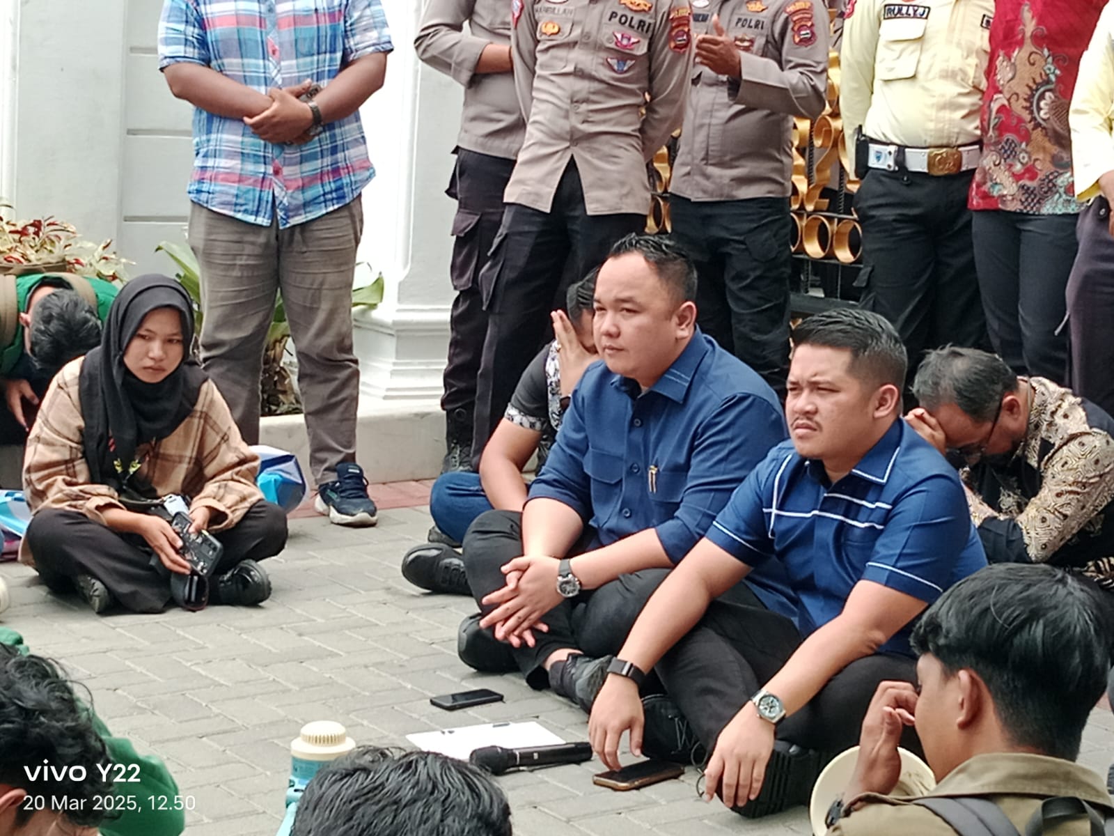 Pimpinan DPRD Provinsi Sumatera Barat, Muhammad Iqra Chissa dan Nanda Satria menerima pengunjuk rasa dari Koalisi Masyarakat Sipil Sumatera Barat ke DPRD Provinsi Sumatera Barat, Rabu (20/3/2025).