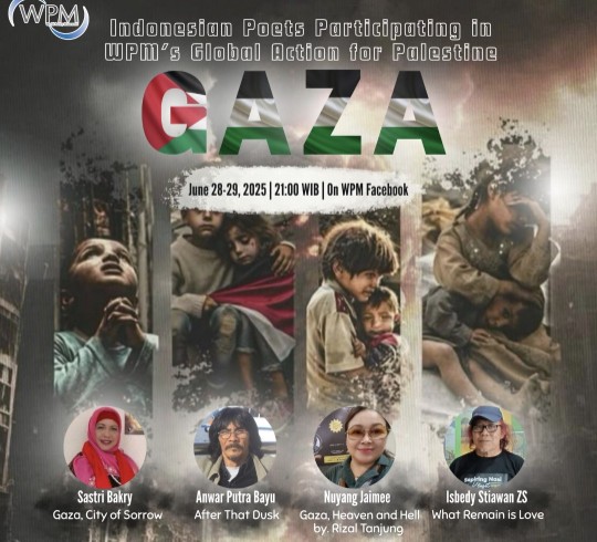 Gerakan Puisi Dunia —World Poetry Movement– yang berpusat di Colombia menghelat pembacaan puisi dan musik bertema Aksi Global untuk Palestina. Empat penyair Indonesia lolos seleksi untuk tampil pada acara yang digelar 28-29 Juni 2025.
