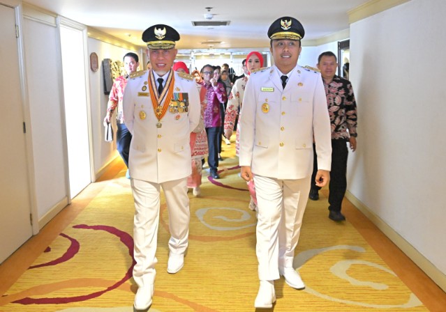 Gubernur Sumatera Barat (Sumbar), Mahyeldi Ansharullah bersama Wagub Vasko Ruseimy tampil gagah dalam prosesi pelantikan Kepala Daerah Serentak di Istana Kepresidenan RI, Kamis (20/02/2025). Selain berbalut Pakaian Dinas Upacara (PDU) Putih, keduanya juga tampak kokoh ditopang sepatu pantofel putih merek Yoesani, yang merupakan produk UMKM lokal di Sumbar.