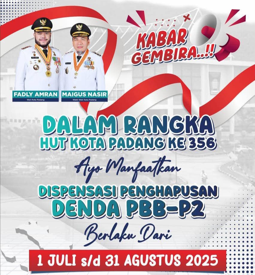 Menyambut Hari Jadi Kota Padang (HJK) ke-356, Pemerintah Kota Padang memberikan kado untuk masyarakat dengan menghapuskan biaya denda Pajak Bumi dan Bangunan Perdesaan dan Perkotaan (PBB P2). Kebijakan strategis ini sudah berlaku sejak 1 Juli hingga 31 Agustus 2025.