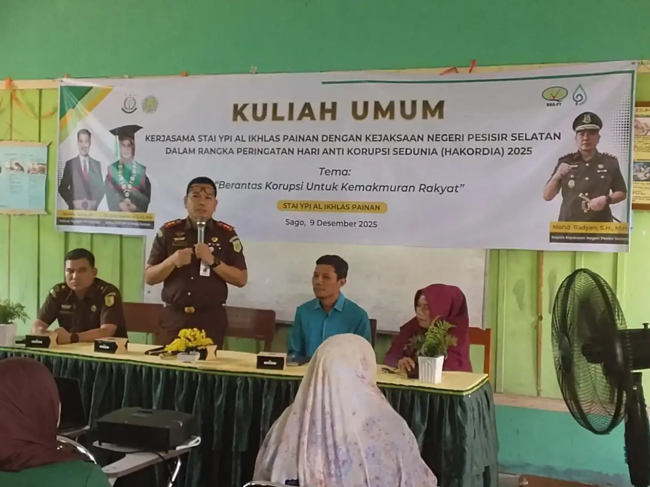 Dalam rangka peringatan Hari Anti Korupsi Sedunia (HAKORDIA) Tahun 2025, Kepala Kejaksaan Negeri Pesisir Selatan Mohd Radyan, SH.,MH memberikan kuliah umum di depan mahasiwa Sekolah Tinggi Agama Islam Yayasan Pendidikan Islam (STAI YPI) Al-Ikhlas Sago, Kecamatan IV Jurai, Kabupaten Pesisir Selatan, Selasa (9/12/2025).