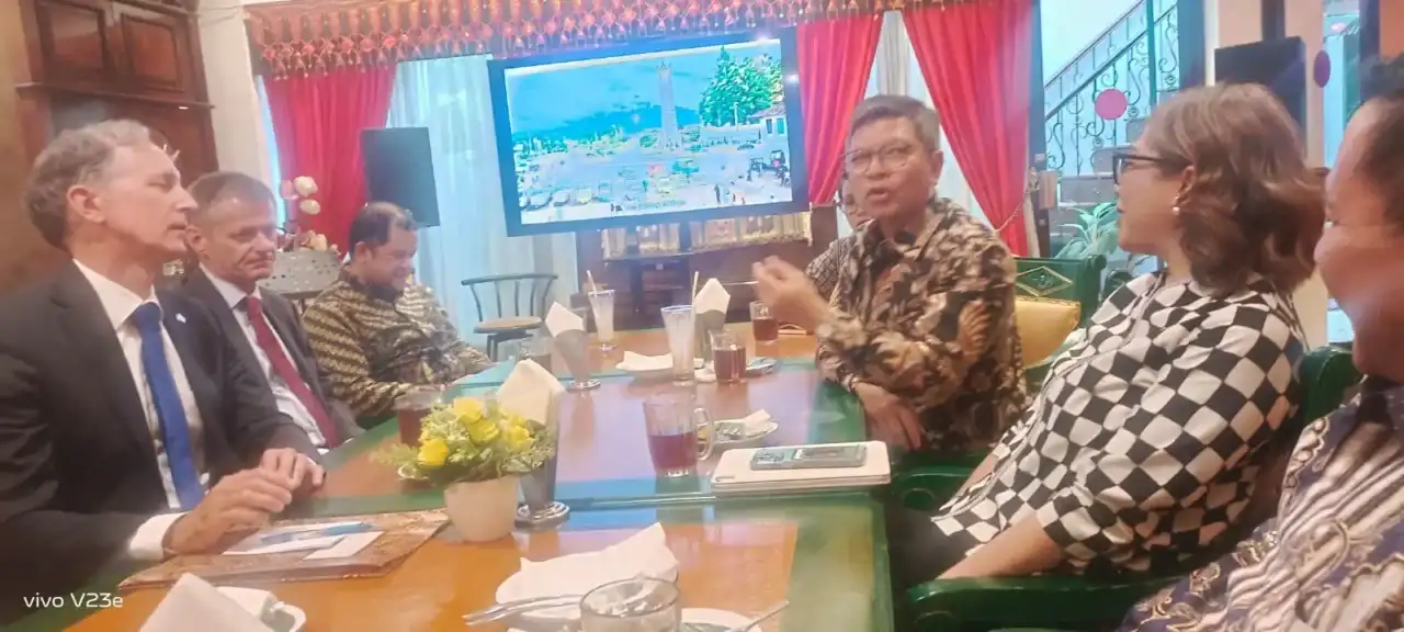 Sekjen Kementerian Luar Negeri (Kemlu) Republik Indonesia, Deni Abdi, memfasilitasi pertemuan Pemerintah Kota Bukittinggi dan Ketua Festival Literasi Internasional Minangkabau ke-4, (International Minangkabau Literacy Festival-IMLF-4) dengan Dirjen Amerika Eropa, Duta Besar Belanda dan Duta Besar Jerman, Senin (30/3/2026) di ruang VIP, Rumah Makan Natrabu, Jakarta.