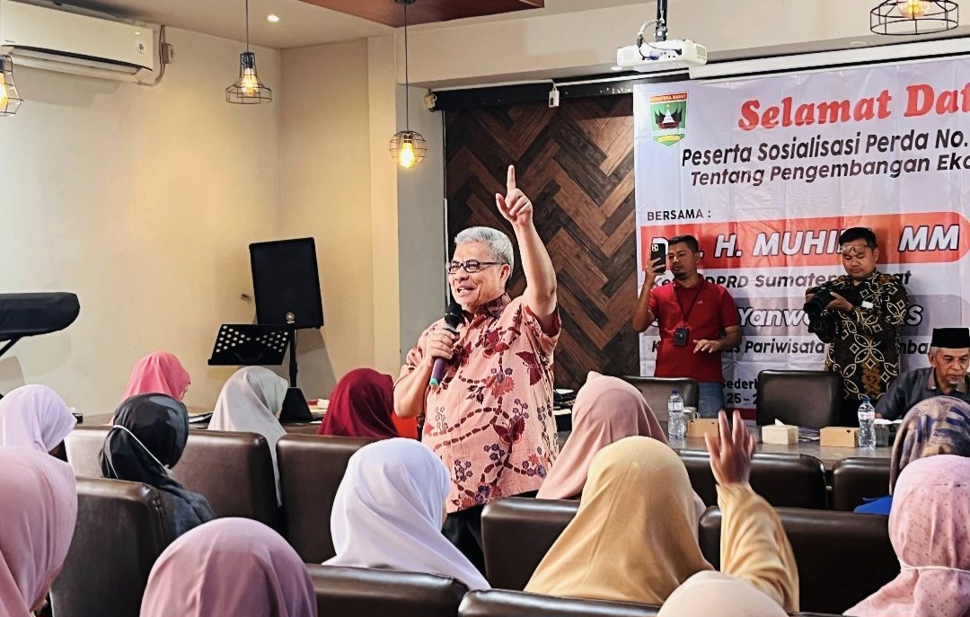 Ketua DPRD Sumatera Barat, Muhidi, melaksanakan Sosialisasi Peraturan Daerah (Sosper) Nomor 2 Tahun 2023 tentang Pengembangan Ekonomi Kreatif di salah satu restoran di Kota Padang, Sabtu (25/10/2025). Kegiatan tersebut dihadiri oleh Dinas Pariwisata Sumbar melalui Kepala Bidang Ekonomi Kreatif, Wahendra, serta ibu-ibu dari seluruh kecamatan di Kota Padang.