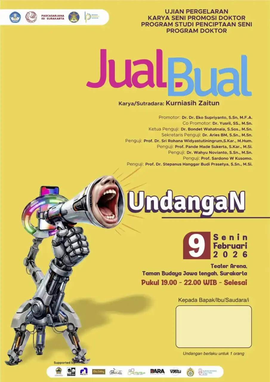Promovenda Kurniasih Zaitun, mahasiswa Program Doktor (S3) Penciptaan Seni Program Pascasarjana Institut Seni Indonesia (ISI) Surakarta, akan menggelar sidang promosi doktoral melalui pementasan karya teater berjudul Jual Bual, Senin 9 Februari 2026, di Teater Arena Taman Budaya Surakarta, Jawa Tengah, pukul 19.00–22.00 WIB.