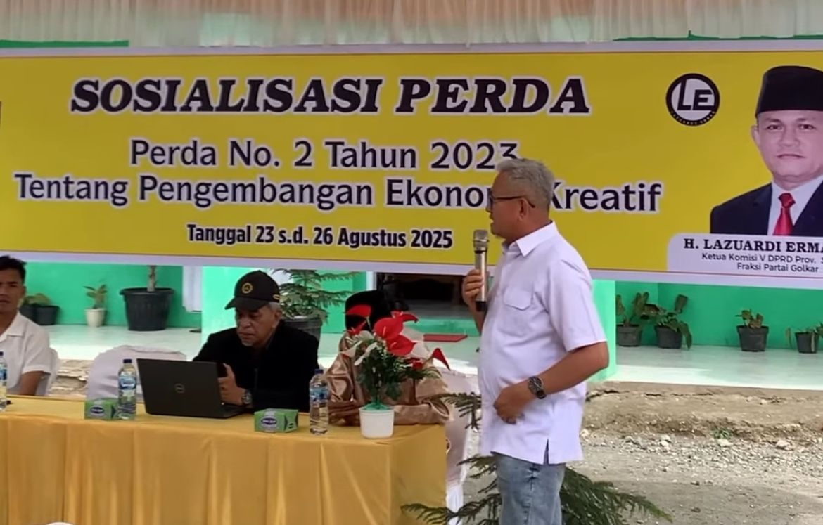 Anggota DPRD Sumbar, Lazuardi Erman, melaksanakan Sosialisasi Peraturan Daerah (Sosperda) di Matur, Kabupaten Agam, Minggu (24/8/2025). Kegiatan ini mengangkat Perda No. 2 Tahun 2023 tentang pengembangan ekonomi kreatif.