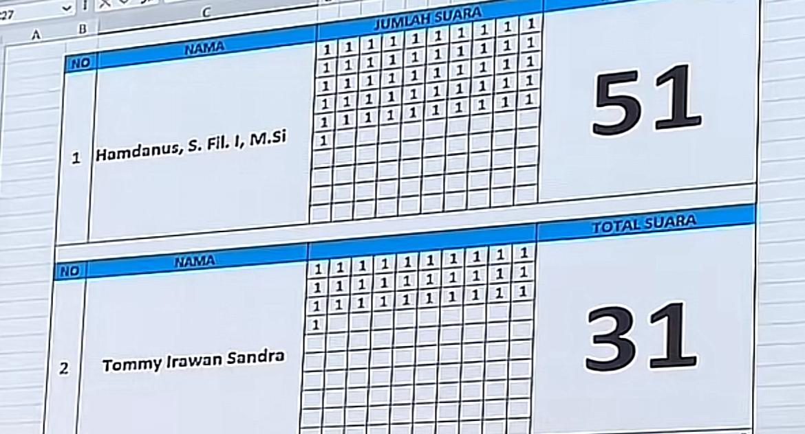 Dalam proses pemilihan, terdapat 84 voters yang memberikan suara. Hasil perhitungan menunjukkan Hamdanus memperoleh 51 suara. Ia unggul dari pesaingnya, Tommy Irawan Sandra, yang mengantongi 31 suara. Sementara dua suara dinyatakan tidak sah oleh panitia.