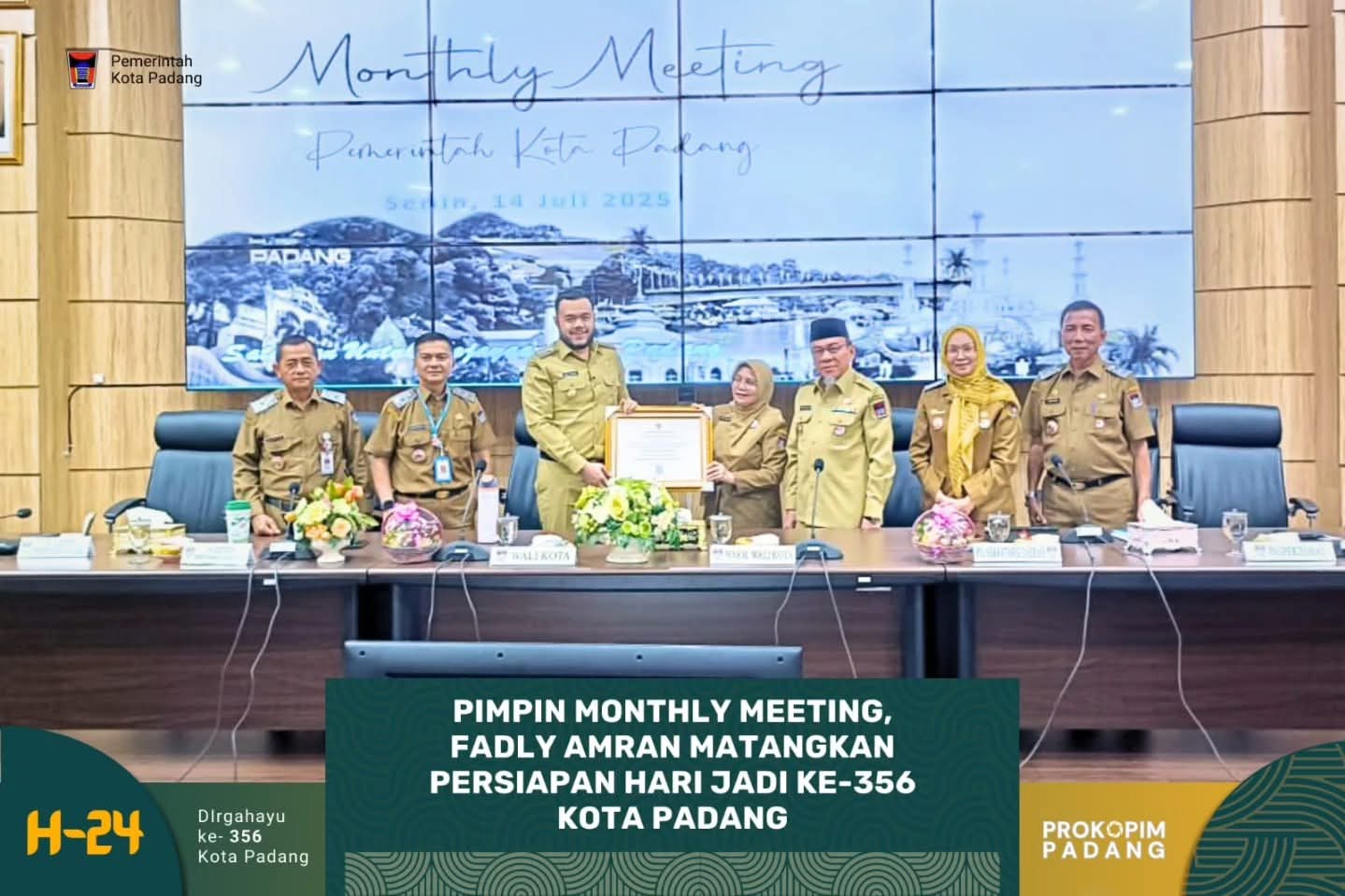 Pemerintah Kota Padang mempersiapkan perayaan Hari Jadi ke-356 Kota Padang. Sebagai bentuk kesiapan, Pemerintah Kota Padang menggelar rapat staf bulanan (monthly meeting) yang dipimpin langsung oleh Wali Kota Padang, Fadly Amran, di Ruang Abu Bakar Ja’ar, Balai Kota Padang, Aie Pacah, Senin (14/7/2025).
