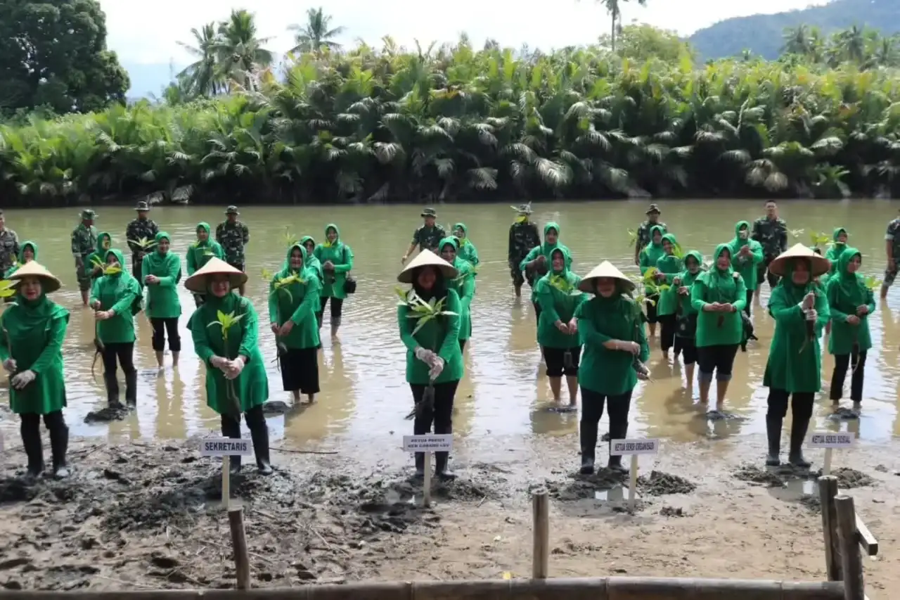Aksi peduli lingkungan ditunjukkan Persit Kartika Chandra Kirana jajaran Kodim 0311/Pessel, dengan aksi tanam mangrove di Pantai Salido, Kecamatan IV Jurai, Kabupaten Pesisir Selatan, Selasa (14/4/2026).