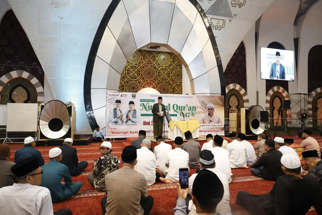 Gubernur Sumatera Barat (Sumbar), Mahyeldi Ansharullah, mengajak masyarakat untuk terus membumikan nilai-nilai Al-Qur’an dalam kehidupan sehari-hari. Ajakan tersebut disampaikannya dalam kegiatan peringatan Nuzulul Qur’an yang digelar Pemerintah Provinsi Sumbar di Masjid Raya Syekh Ahmad Khatib Al Minangkabawi, Kota Padang, Minggu (8/3/2026).