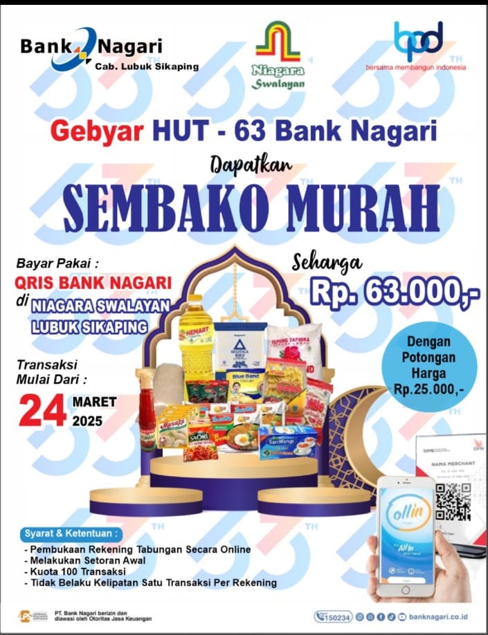Gebyar HUT Bank Nagari ke-63 Sembako Murah ini dimulai pada tanggal 24 Maret 2025 di Niagara Swalayan dan bagi 20 orang yang melakukan transaksi di awal akan mendapatkan sovenir dari Bank Nagari.