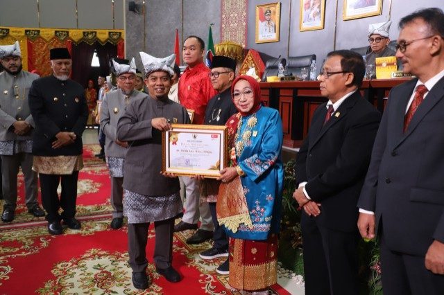Ketua DPRD Kota Padang Muharlion menyerahkan Piagam Penghargaan Pemko Padang kepada Dr. Afrida Azis tokoh masyarakat bidang kesehatan
