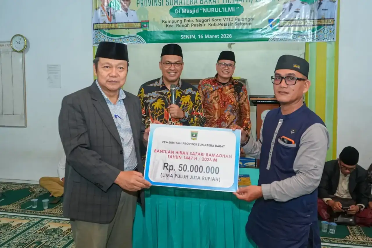 Sekretaris Daerah Provinsi Sumatera Barat (Sekdaprov Sumbar), Arry Yuswandi memimpin Tim Safari Ramadan Pemerintah Provinsi Sumbar berkunjung ke Masjid Nurul Ilmi, Kampung Pale, Nagari Koto VIII Pelangai, Kecamatan Ranah Pesisir, Kabupaten Pesisir Selatan, Senin (16/3/2026).