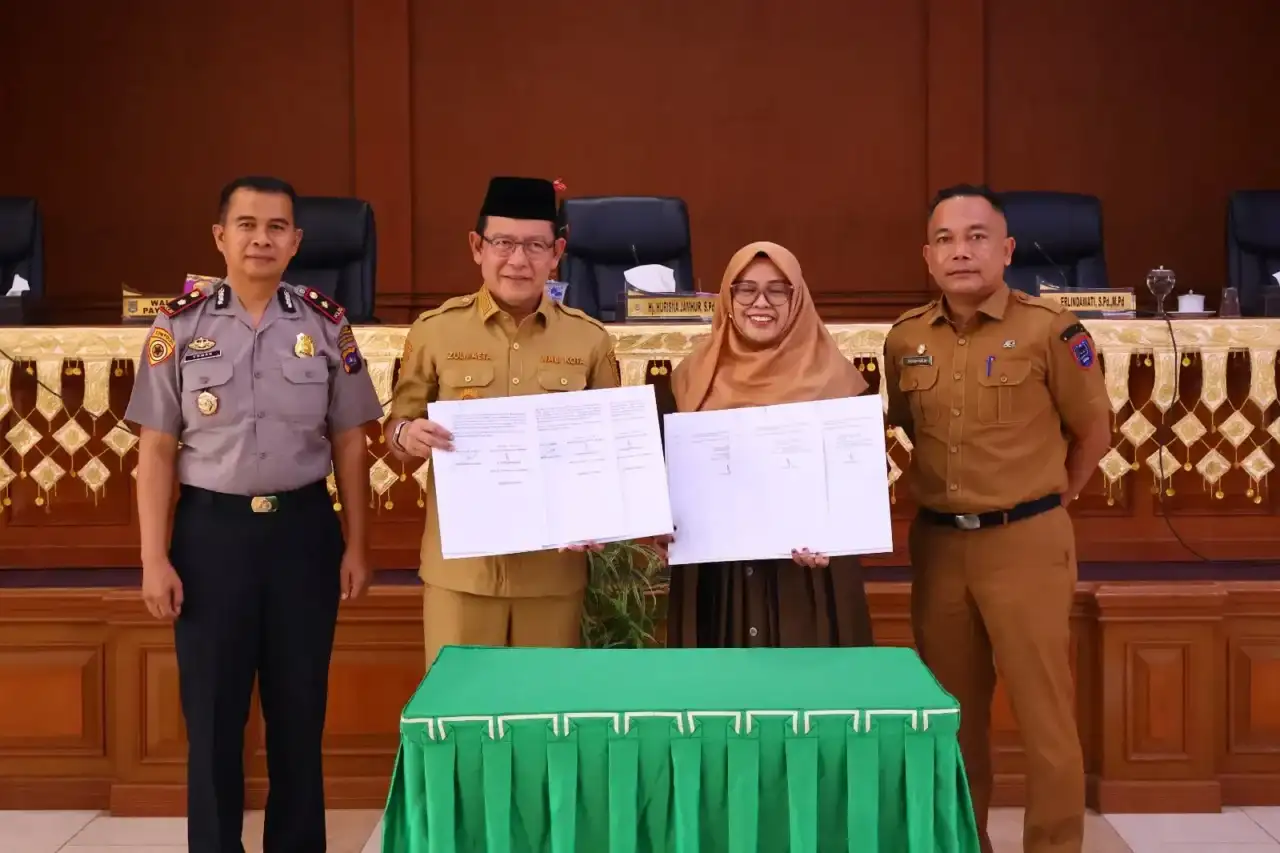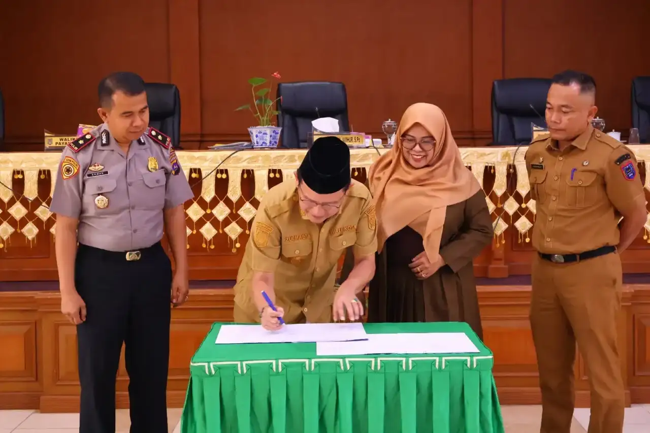 Walikota Payakumbuh Zulmaeta membubuhkan tanda tangan persetujuan Ranperda menjadi Perda disaksikan Pimpinan DPRD