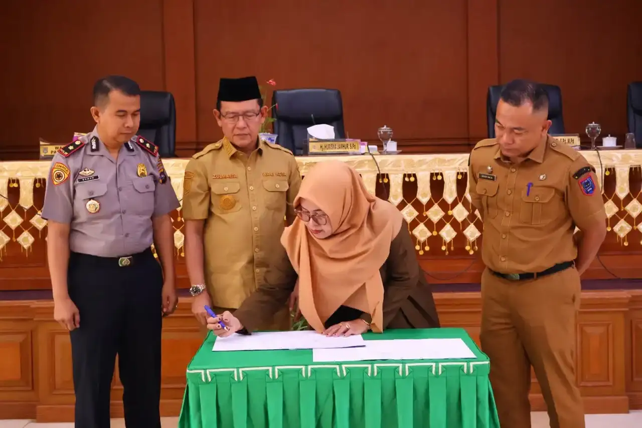 Wakil Ketua DPRD Kota Payakumbuh Hurisna Jamhur membubuhkan tanda tangan persetujuan Ranperda menjadi Perda disaksikan Walikota Zulmaeta dan Forkopimda