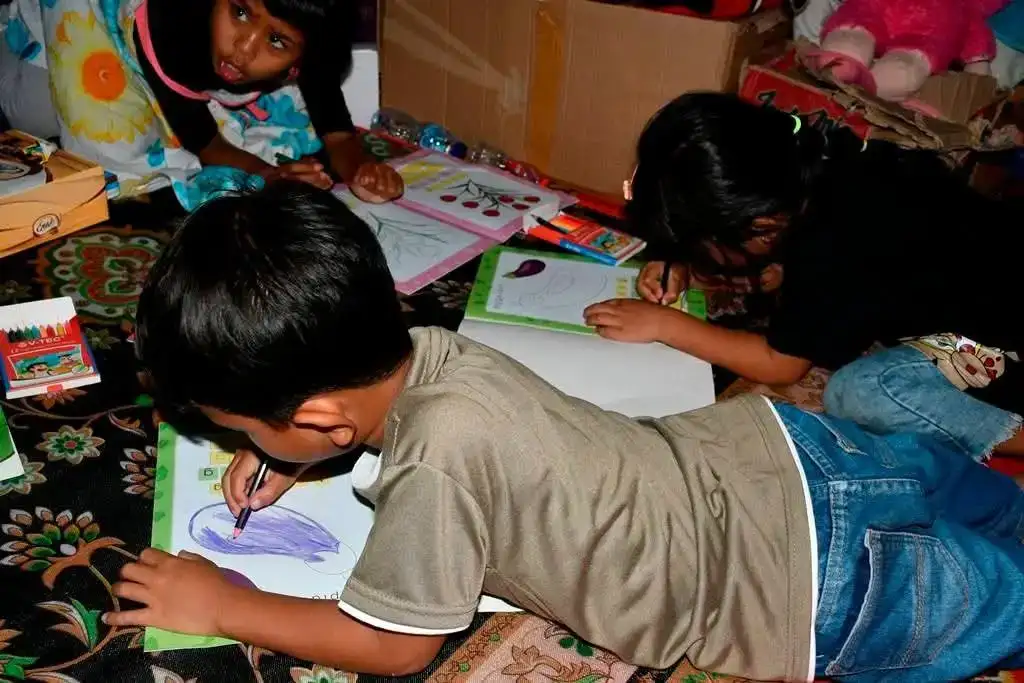 Anak-anak di Posko Guo langsung memanfaatkan bantuan Dekranasda Kota Padang, sibuk menggambar dan mewarnai