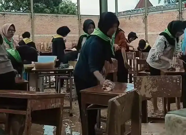 Puluhan ASN dari sejumlah OPD berkumpul di halaman depan SMA 12. Kelas dibersihkan. Meja dan kursi belajar yang sebelumnya semrawut posisinya, ditata kembali.