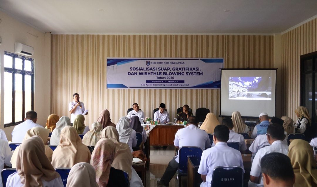 Pemko Payakumbuh terus memperkuat langkah pencegahan korupsi dengan menyelenggarakan Sosialisasi Suap, Gratifikasi, dan Aplikasi Whistle Blowing System (WBS) di Aula Bersama Inspektorat Kota Payakumbuh, Rabu (29/10/2025).