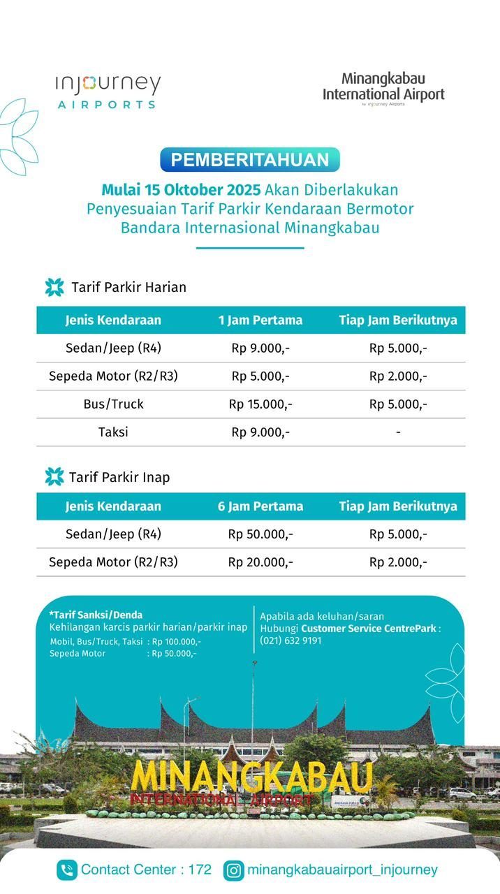 Bandara Internasional Minangkabau (BIM) menyesuaikan tarif parkir untuk meningkatkan mutu layanan dan kenyamanan pengguna jasa. Langkah ini merupakan hasil survei bersama Forum Konsumen Berdaya Indonesia dan Pemerintah Daerah Padang Pariaman.