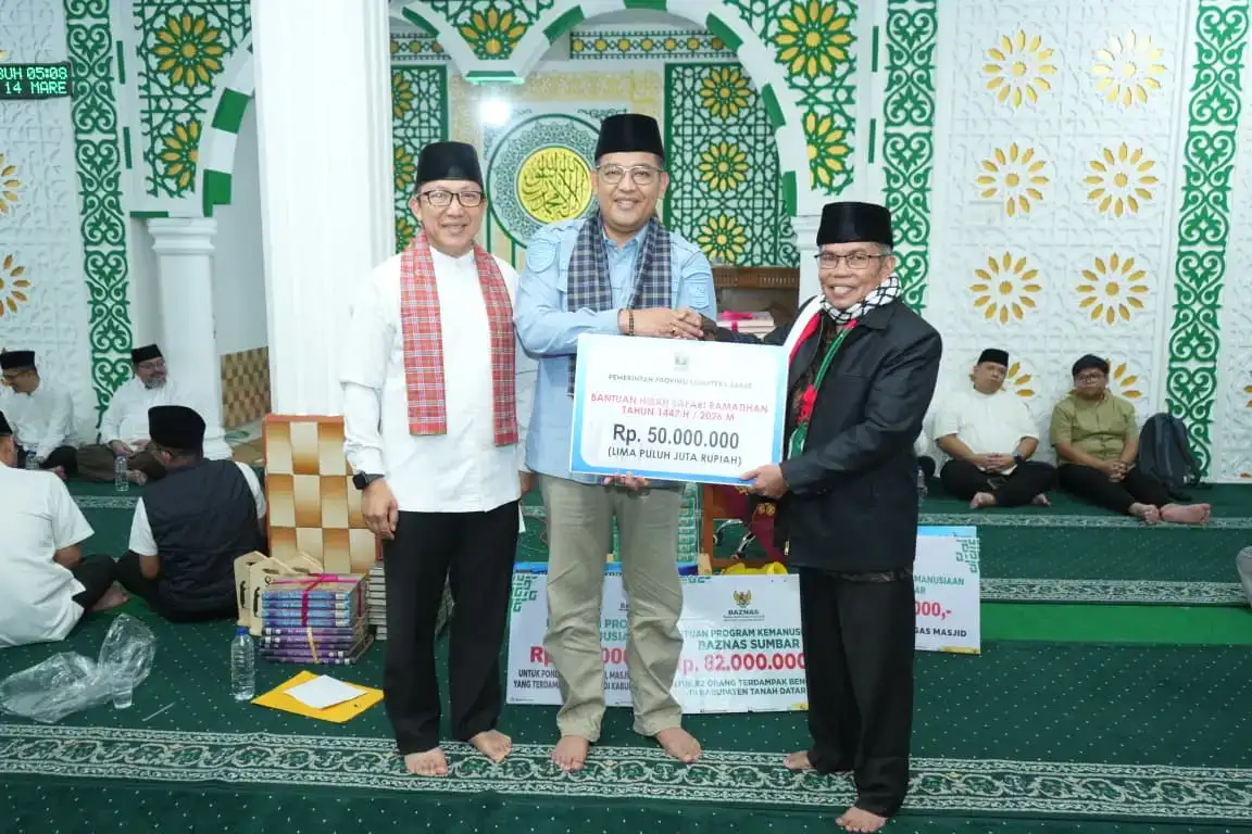 Dalam kesempatan tersebut, Tim Safari Ramadan Pemprov Sumbar menyalurkan berbagai bantuan kepada masyarakat dan pengurus masjid. Bantuan tersebut berupa hibah untuk Masjid Lasykar sebesar Rp50 juta, bantuan dari CSR Bank Nagari sebesar Rp10 juta, serta 40 Al-Qur’an dari ASN Pemprov Sumbar.