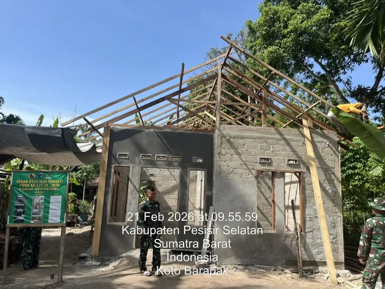 Sabtu (21/2/2026) Sertu Deri Putra selaku Kordinator mengungkapkan pekerjaan rehab RTLH yaitu pembersihan genting dan dilanjutkan dengan pemasangan genteng dalam rehab RTLH milik Ibu Suharti warga Nagari Koto Berapak, Kecamatan Bayang, Kabupaten Pesisir Selatan.
