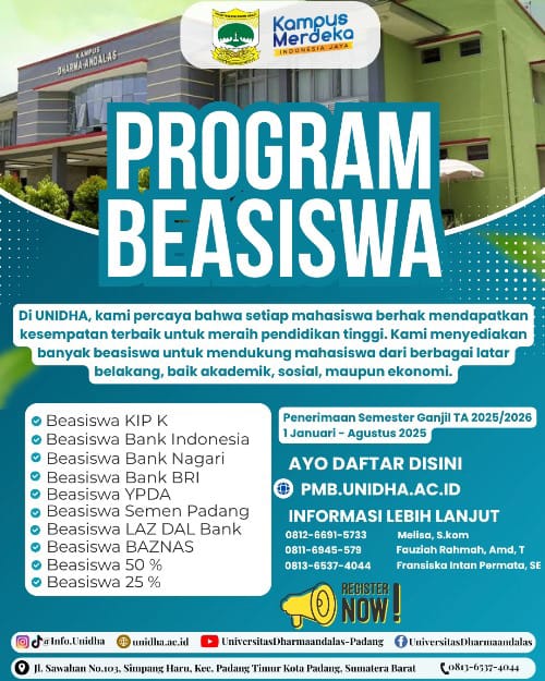 Universitas Dharma Andalas (Unidha) terus menunjukkan komitmennya dalam mendukung pendidikan tinggi berkualitas dan inklusif melalui berbagai program beasiswa. Dengan kolaborasi bersama sejumlah institusi ternama.