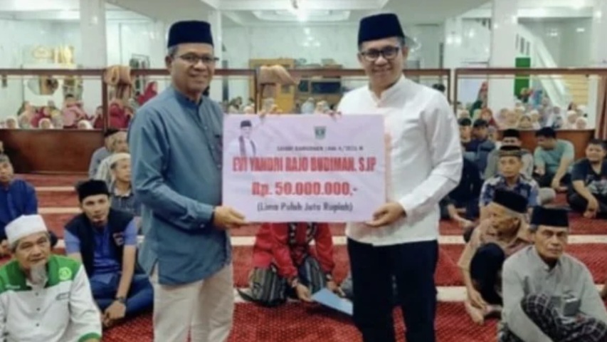Pada kesempatan itu, Evi Yandri Rajo Budiman menyerahkan bantuan dana secara simbolis Rp50 juta dan mushaf Alquran kepada pengurus masjid.