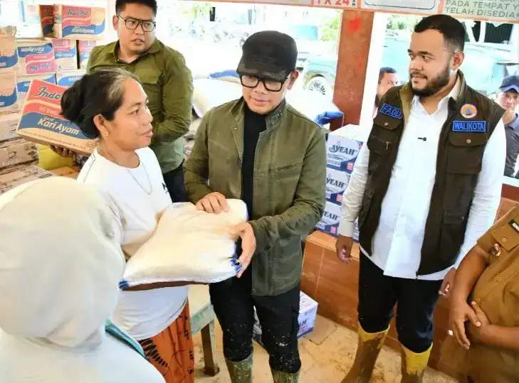 Wamendagri Bima Arya didampingi Wako Padang Fadly Amran menyerahkan bantuan beras kepada warga yang terdampak banjir